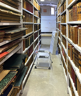Ce chantier consiste en un dépoussiérage sur les 6 faces externes de la totalité des fonds conservés en cave 5, soit 114,35 mètres linéaires comprenant 4 376 volumes. L’aspiration a été réalisée à l’aide d’un aspirateur HEPA, garantissant l’élimination efficace des poussières volatiles sans risque pour les livres ni pour les équipements de conservation.